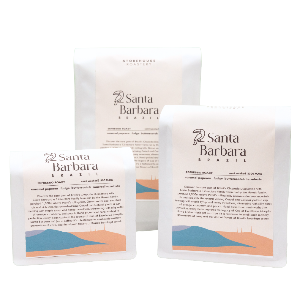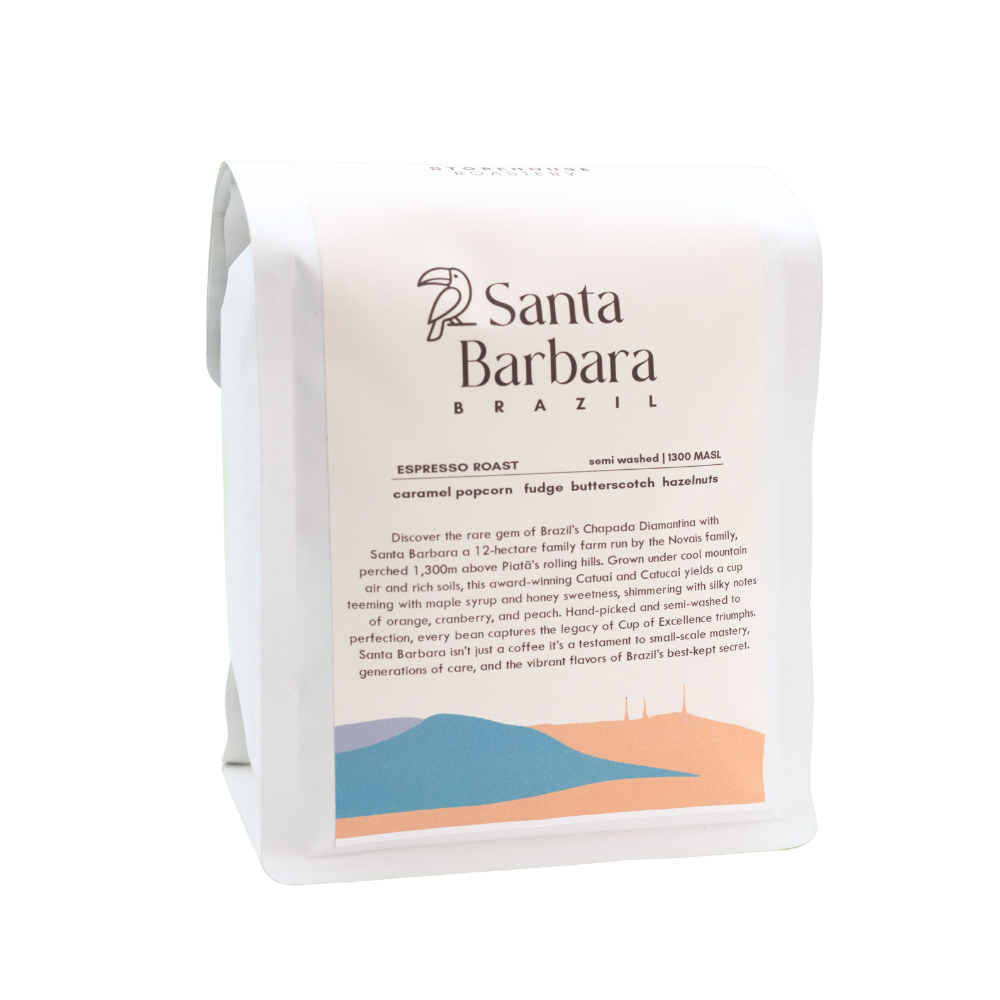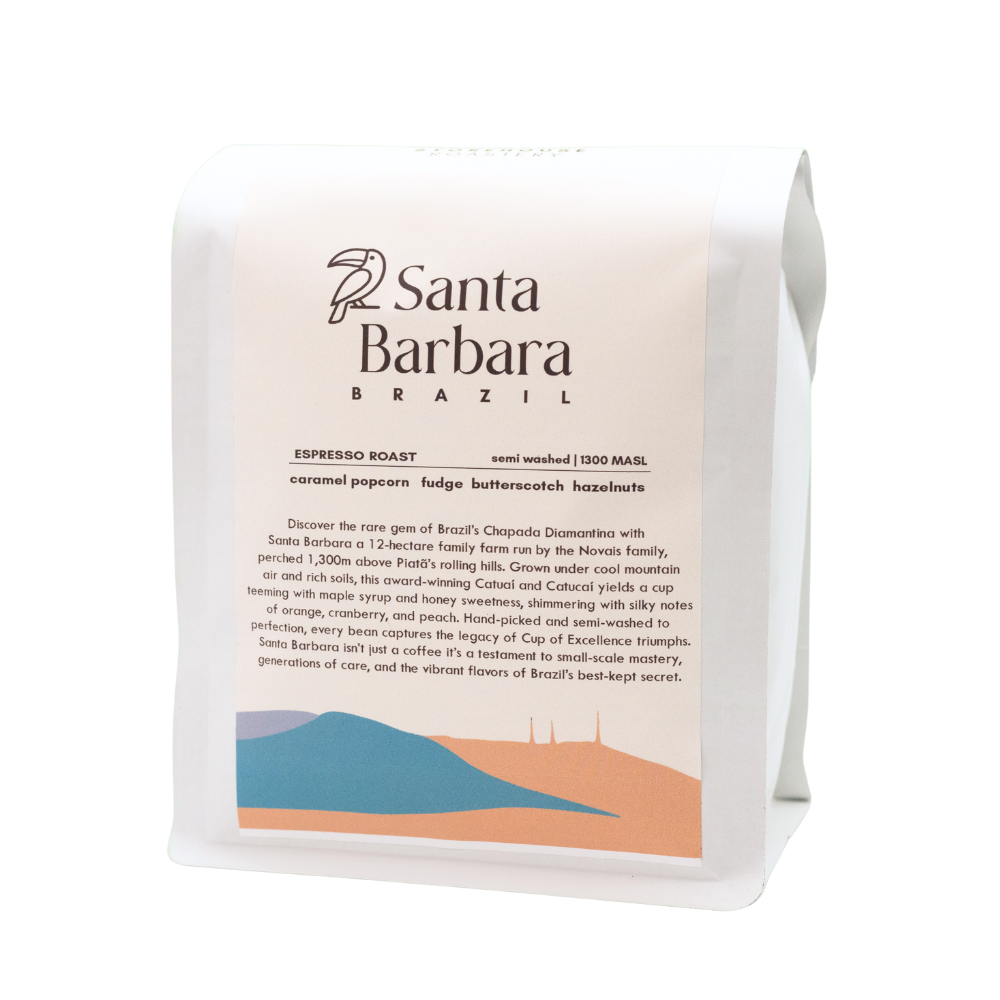 Discover the rare gem of Brazil's Chapada Diamanting with Santa Barbara a 12-hectare family farm run by the Novais family, perched 1,300m above Piatä's rolling hills. Grown under cool mountain air and rich soils, this award-winning Catuai and Catucai yields a cup teeming with maple syrup and honey sweetness, shimmering with silky notes of orange, cranberry, and peach. Hand-picked and semi-washed to perfection, every bean captures the legacy of Cup of Excellence triumphs.